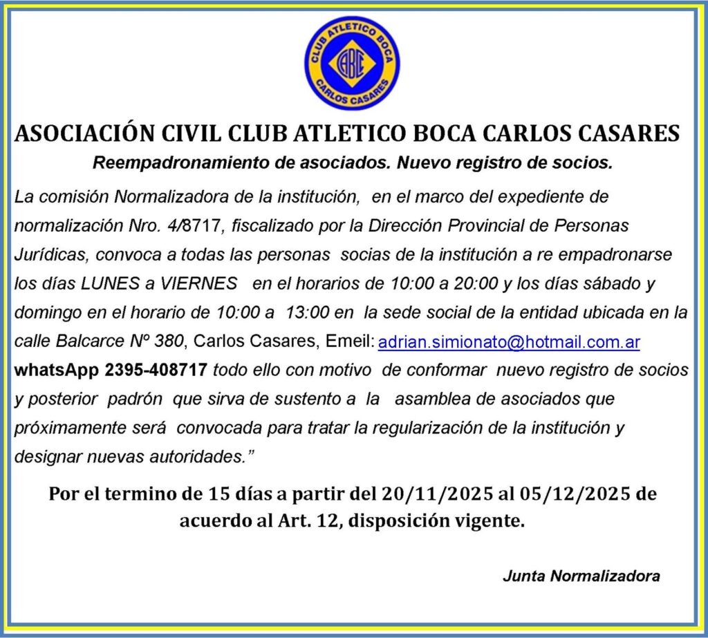 La comisión Normalizadora de la institución, en el marco del expediente de normalización Nro. 4/8717, fiscalizado por la Dirección Provincial de Personas Jurídicas, convoca a todas las personas socias de la institución a re empadronarse los días LUNES a VIERNES en el horarios de 10:00 a 20:00 y los días sábado y domingo en el horario de 10:00 a 13:00 en la sede social de la entidad ubicada en la calle Balcarce Nº 380, Carlos Casares, Emeil: adrian.[email protected] whatsApp 2395-408717todo ello con motivo de conformar nuevo registro de socios…