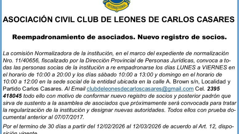 La comisión Normalizadora de la institución, en el marco del expediente de normalización Nro. 11/40656, fiscalizado por la Dirección Provincial de Personas Jurídicas, convoca a todas las personas socias de la institución a re empadronarse los días LUNES a VIERNES en el horario de 10:00 a 20:00 y los días sábado 10:00 a 13:00 y domingo en el horario de 10:00 a 12:00 en la sede social de la entidad ubicada en la calle A. Brown s/n, Localidad y Partido Carlos Casares. Al Email [email protected] Cel. 2395 418045 todo ello con motivo de conformar nuevo registro de socios y posterior padrón que sirva de sustento a la asamblea de asociados que próximamente será convocada para tratar la regularización de la institución y designar nuevas autoridades. Todos ellos con prueba documental anterior al 07/07/2017.