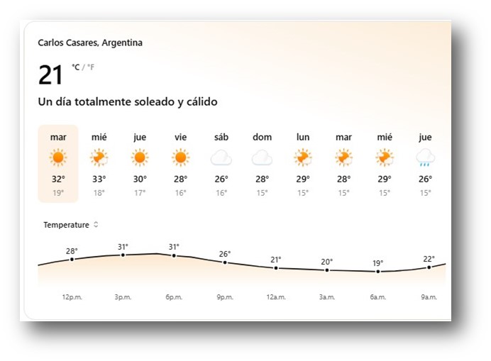 | Miércoles 18 | 31°C | 19°C | Mayormente soleado y caluroso |