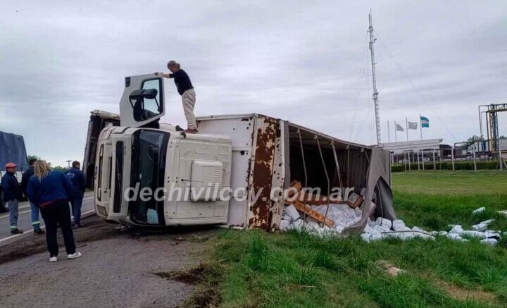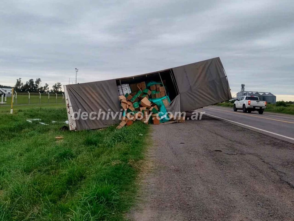 En la tarde del lunes se produjo un accidente vehicular en la Ruta Nacional 5, en el kilómetro 161,300. Por causas que aún se tratan de establecer, un camión Volvo VM260 de color blanco, patente LDX-760, que arrastraba un acoplado marca Montenegro, patente MZO-305 que llevaba una carga de agroquímicos, perdió el control, despistó y volcó.