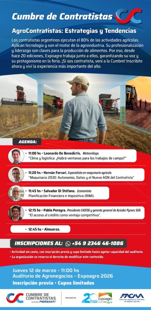 La Cumbre de Contratistas edición Piersanti será uno de los nuevos contenidos que se suman a Expoagro 2026 edición YPF Agro en el año de su 20° aniversario, consolidando un espacio específico de análisis y proyección para el sector contratista dentro de la mayor muestra agroindustrial a cielo abierto de la región que se realizará del 10 al 13 de marzo en el predio ferial y autódromo de San Nicolás.