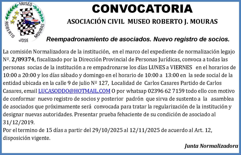 La comisión Normalizadora de la institución, en el marco del expediente de normalización legajo Nº. 2/89374, fiscalizado por la Dirección Provincial de Personas Jurídicas, convoca a todas las personas socias de la institución a re empadronarse los días LUNES a VIERNES en el horarios de 10:00 a 20:00 y los días sábado y domingo en el horario de 10:00 a 13:00 en la sede social de la entidad ubicada en la calle 9 de julio Nº 127, Localidad de Carlos Casares Partido de Carlos Casares,…
