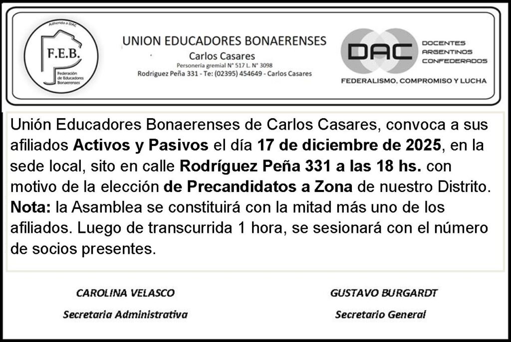 Unión Educadores Bonaerenses de Carlos Casares, convoca a sus afiliados Activos y Pasivos el día 17 de diciembre de 2025, en la sede local, sito en calle Rodríguez Peña 331 a las 18 hs. con motivo de la elección de Precandidatos a Zona de nuestro Distrito…