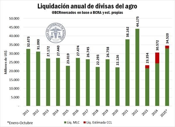 Para los dos meses restantes, se estima que la liquidación en el Mercado de Cambios sume US$ 2.600 millones, por lo que el año 2025 se proyecta que cierre con US$ 37.150 millones liquidados por el sector entre todos los mercados de cambios.
