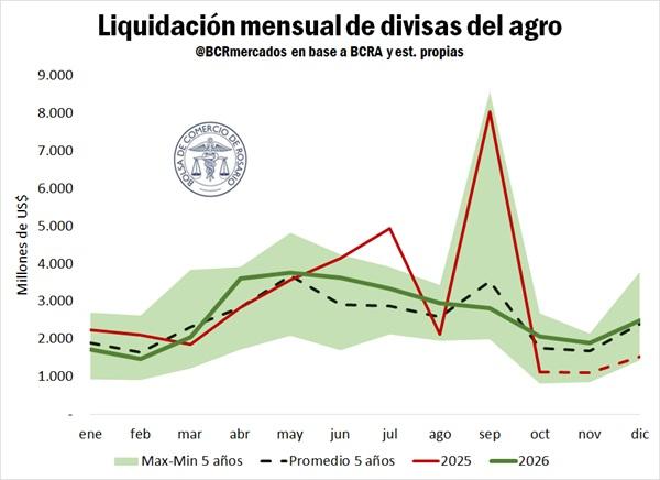 Este efecto de menor liquidación proyectada para el cierre del año producto del adelantamiento bajo los distintos esquemas de incentivos se espera continúe durante el primer trimestre del año próximo, hasta el empalme de la nueva cosecha. Entre enero y marzo se estima un valor de US$ 5.250 millones, inferior al promedio de US$ 5.900 del primer trimestre en los últimos 5 años. Fuente Bolsa de Comercio de Rosario