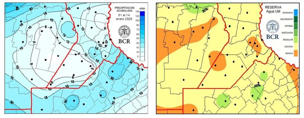En esta etapa, el promedio de lluvias fue de 13 mm cuando la media de la región es de 60 mm. Hay estaciones de la red meteorológica de GEA en el sudeste de Córdoba que no registraron milimetrajes, como Labordeboy, Canals y Guatimozín. Las que más midieron fueron las de la localidades de Colonia Almada, con 47 mm; General  Pinto, con 41 mm; y Ramallo y Pergamino, con 40 mm. En El sur de Santa Fe, Bigand acumuló 26 mm. De esta manera, las reservas de agua a 1 metro de profundidad teniendo en cuenta el consumo de una pradera permanente están entre escasas a sequía, con algunos pocos focos regulares, zonas privilegiadas por lluvias aisladas en las últimas semanas.