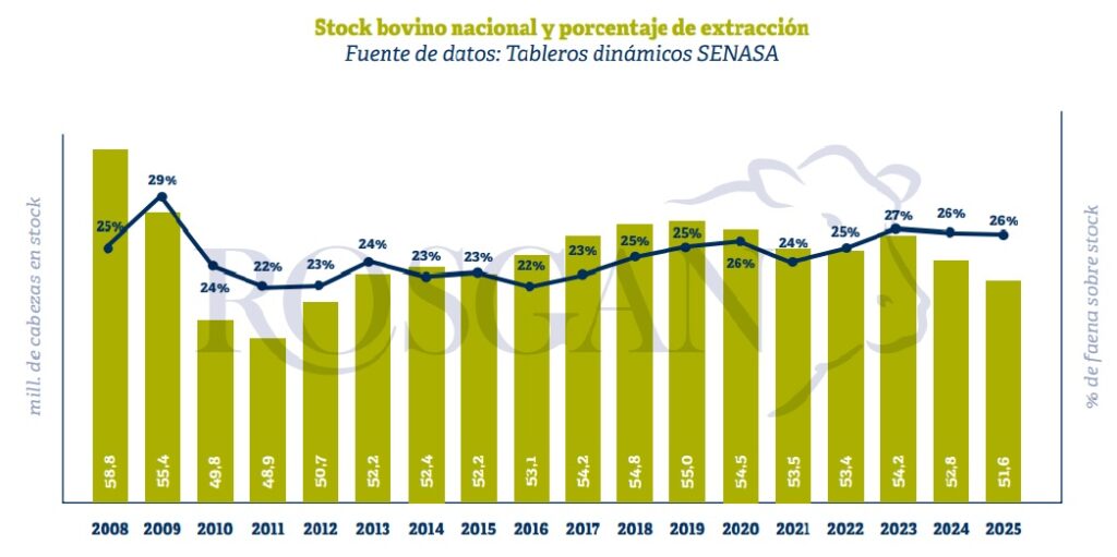 Considerando un stock inicial de 51,6 millones de cabezas, la tasa de extracción se ubicó por encima del 26%. Si bien este indicador muestra una leve caída frente a los dos últimos ciclos, permanece en niveles cercanos a los umbrales de equilibrio.
