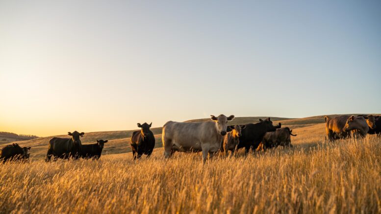 Fat Beef cows grazing on native grasses in a field on a farm practicing regenerative agriculture in Australia. Hereford cattle on pasture. Cows in a field at sunset with golden light.