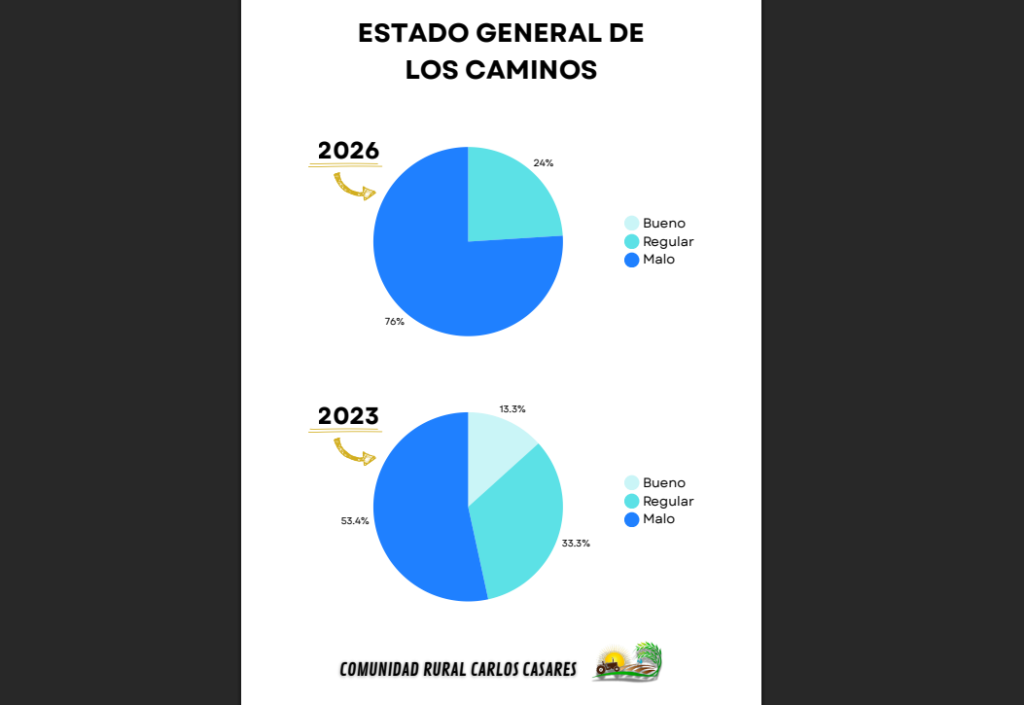 Un informe difundido por la entidad Comunidad Rural Carlos Casares da cuenta del estado desastroso de los caminos rurales. Si bien el trabajo recoge algunas mejoras en transitabilidad, revela problemas estructurales como pozos, el famoso “serrucho”, falta de alcantarillas y otros obstáculos, ante los cuales los productores insisten en poner en marcha un plan integral y darle seguimiento legislativo al tema.