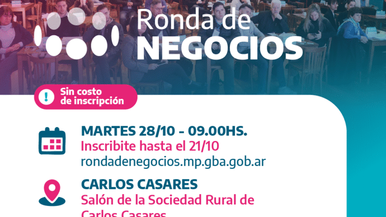 El Ministerio de Producción, Ciencia e Innovación Tecnológica de la Provincia y el municipio de Carlos Casares, con el acompañamiento del Centro Industrial, la Cámara de Comercio, Industria y Servicios y la Sociedad Rural local, convocan a una nueva Ronda de Negocios Multisectorial el próximo martes 28 de octubre a las 9.00 horas, cuya inscripción estará abierta hasta el martes 21 de octubre.