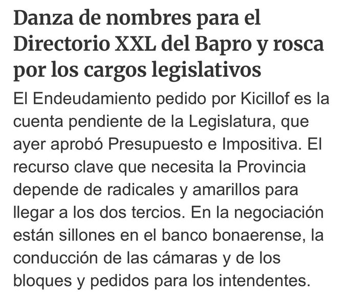 En ese contexto, de aquí al miércoles, las negociaciones se centrarán en dos puntos centrales: 1) el monto final y el modo de distribución del porcentaje del endeudamiento, un 8% del total- previsto para girar a los municipios (las opciones van desde el CUD que se usa parala coparticipación, con una garantía a pagarse en 2026 en tres cuotas hasta un esquema más laxo definido por una bicameral. 2) La ampliación del directorio del Banco Provincia (una idea atribuida a Massa) de 8 a 12 miembros, que plantea el desafío de encontrar un formato legal para hacerlo con rapidez. Y asociado a eso, las garantías de que se respetarán los nombres acordados para integrar ese cuerpo, el Tribunal Fiscal, el consejo de Educación en caso de que fuese necesario tratarlos en una sesión posterior. Fuente: Agencia DIB