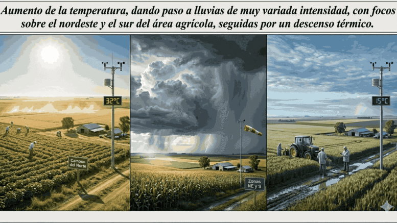 Aumento de la temperatura, dando paso a lluvias de muy variada intensidad, con focos sobre el nordeste y el sur del área agrícola, seguidas por un descenso térmico.