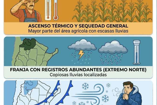 Ascenso térmico, acompañado por precipitaciones escasas en la mayor parte del área agrícola, salvo una franja con registros abundantes sobre su extremo norte, finalizando con una vigorosa entrada de aire frío.