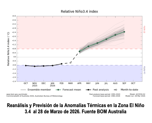 Paralelamente, desde mediados del Verano 2026 en adelante, viene observándose fuertes señales que la Campaña 2026/2027 podría desarrollarse en el marco de un episodio de “El Niño”.