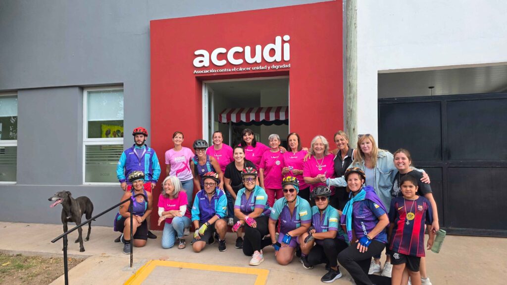 En paralelo, se desarrolló un recorrido en bicicleta junto al grupo “Aventureros del Pedal”. Durante el trayecto, las participantes fueron dejando un adhesivo con la consigna 8M y un moño violeta en distintos espacios vinculados al acompañamiento y la protección de las mujeres.