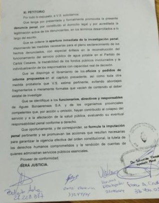 En la demanda, los dirigentes denuncian a ABSA y a funcionarios provinciales por incumplimiento de los deberes de funcionario público y otros delitos derivados de la prestación deficiente, irregular y estructural de un servicio público esencial, con puesta en peligro de la salud pública en el distrito de Carlos Casares.